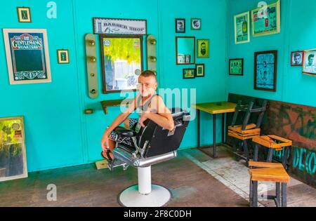 Tourist In Empty Turquoise Hair Salon And Barber Shop Interior In Bangkok Thailand Stock Photo Alamy